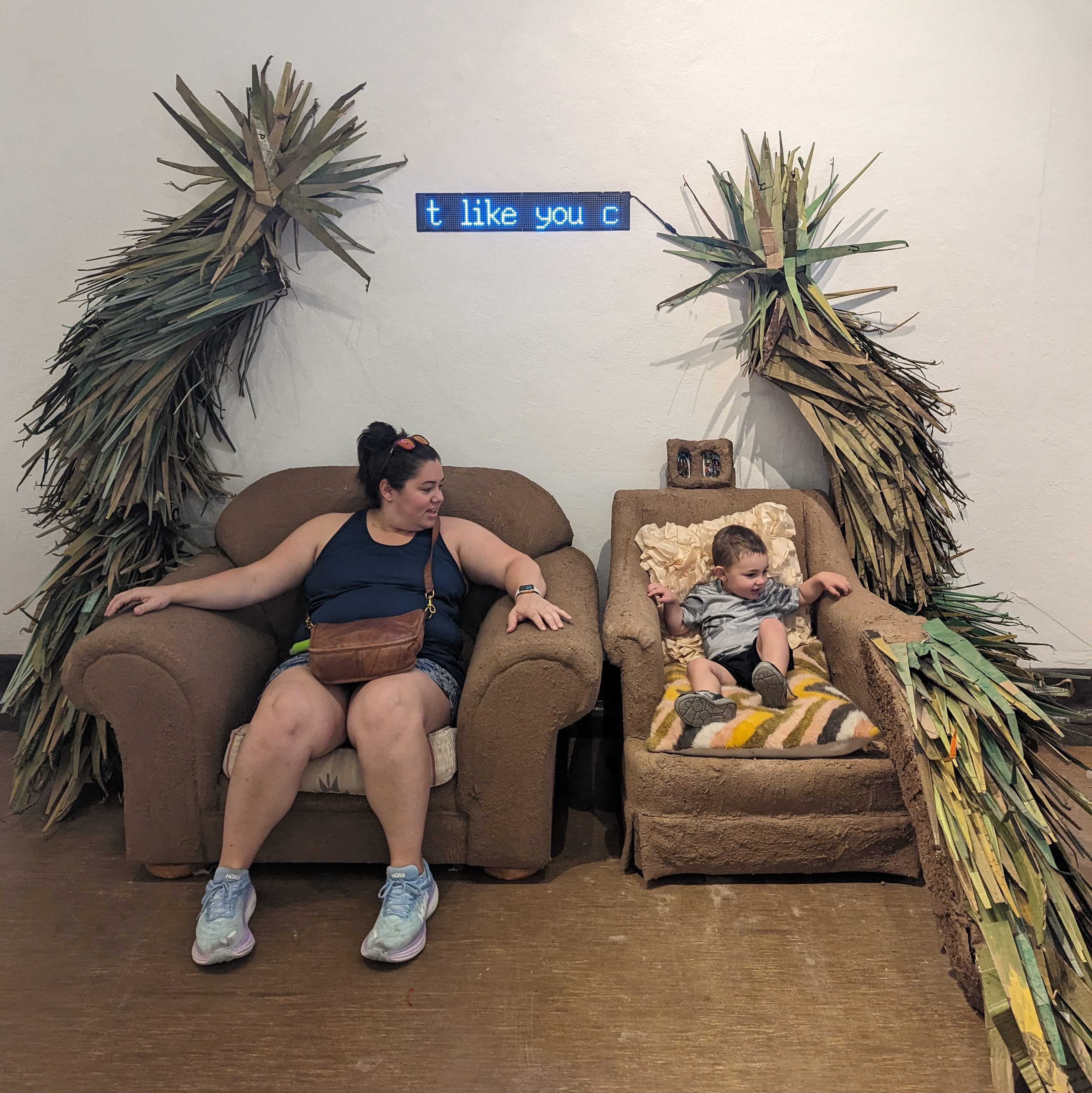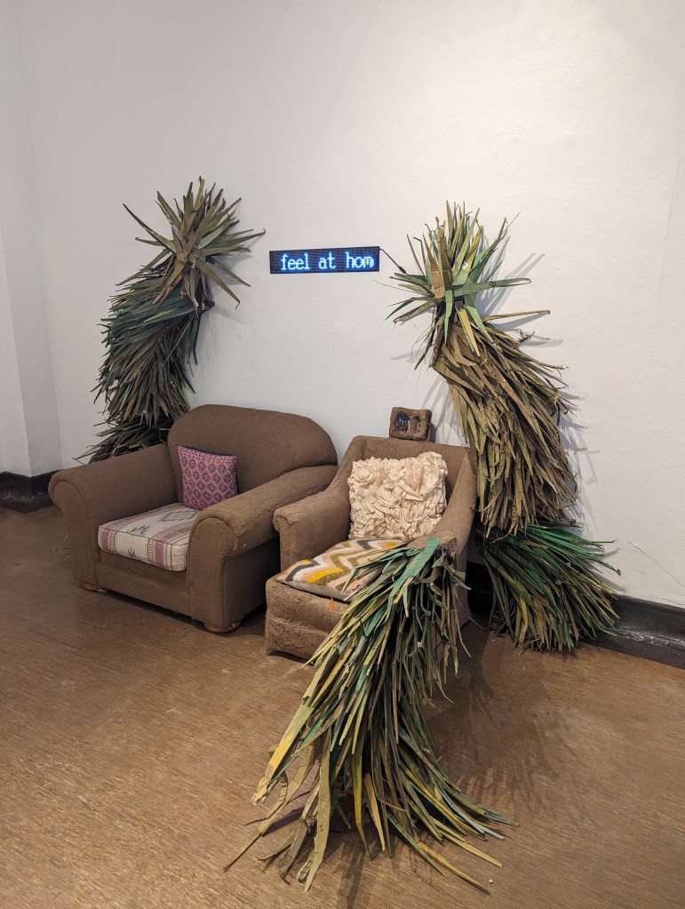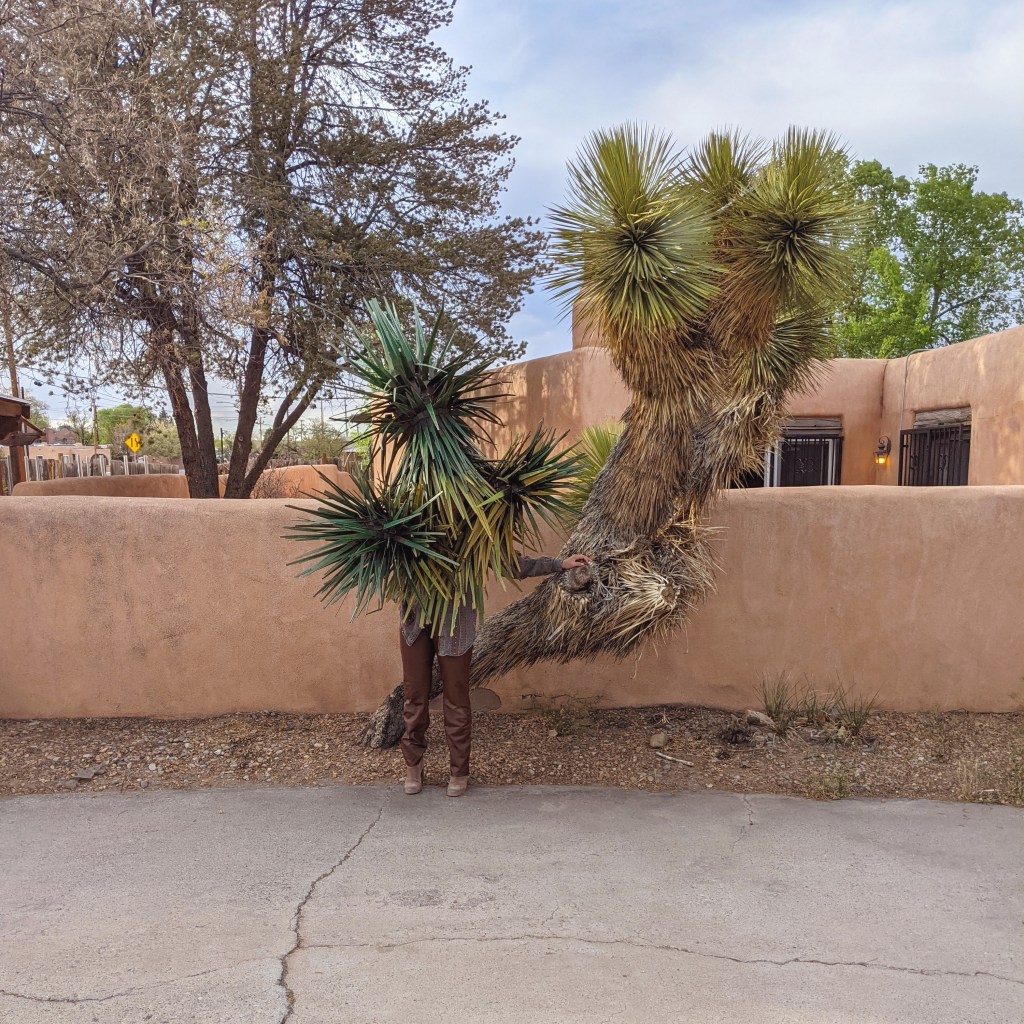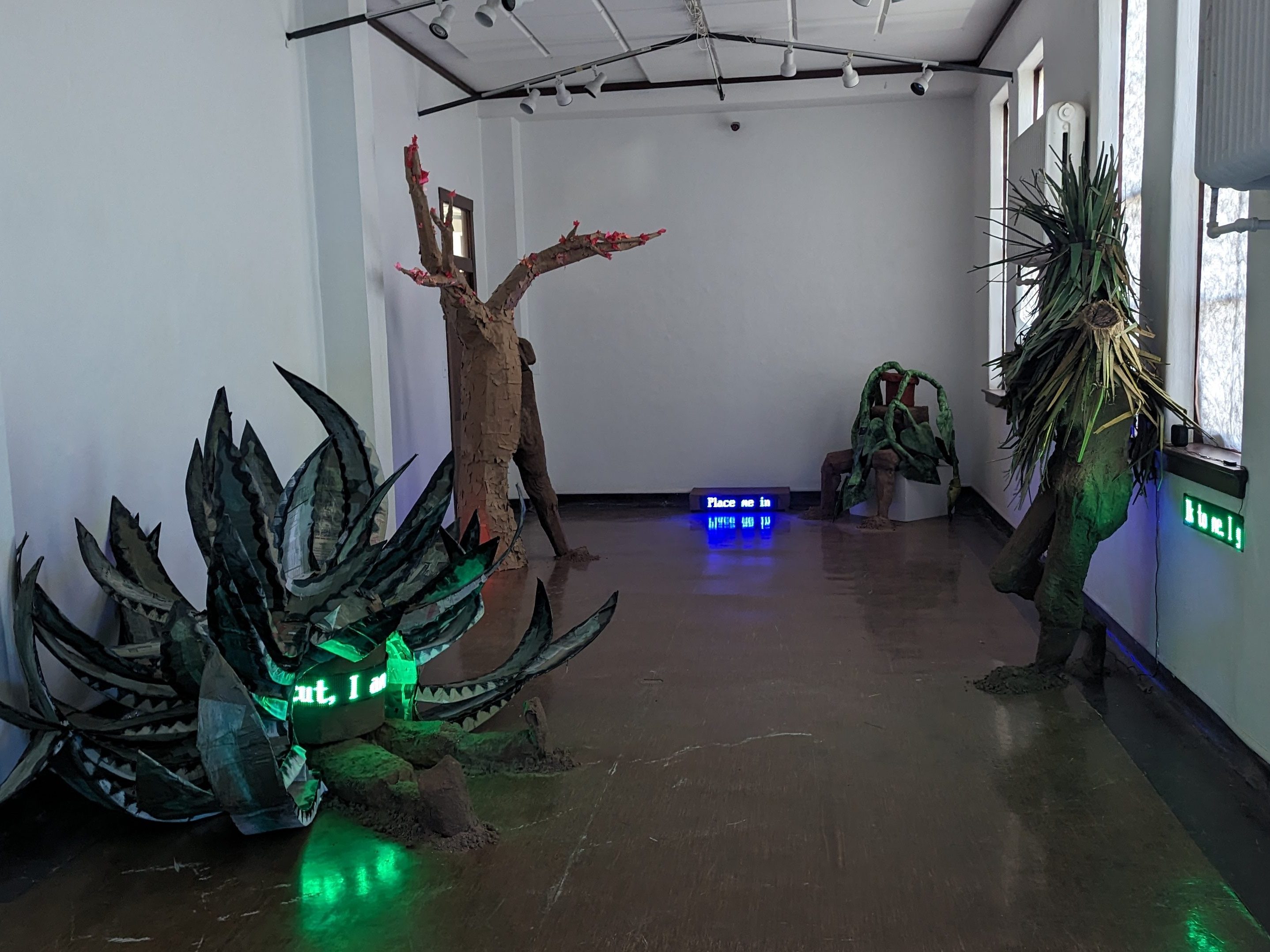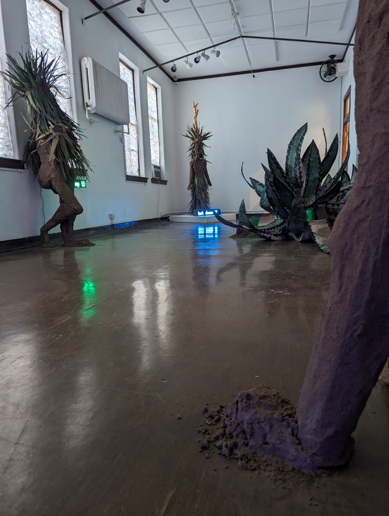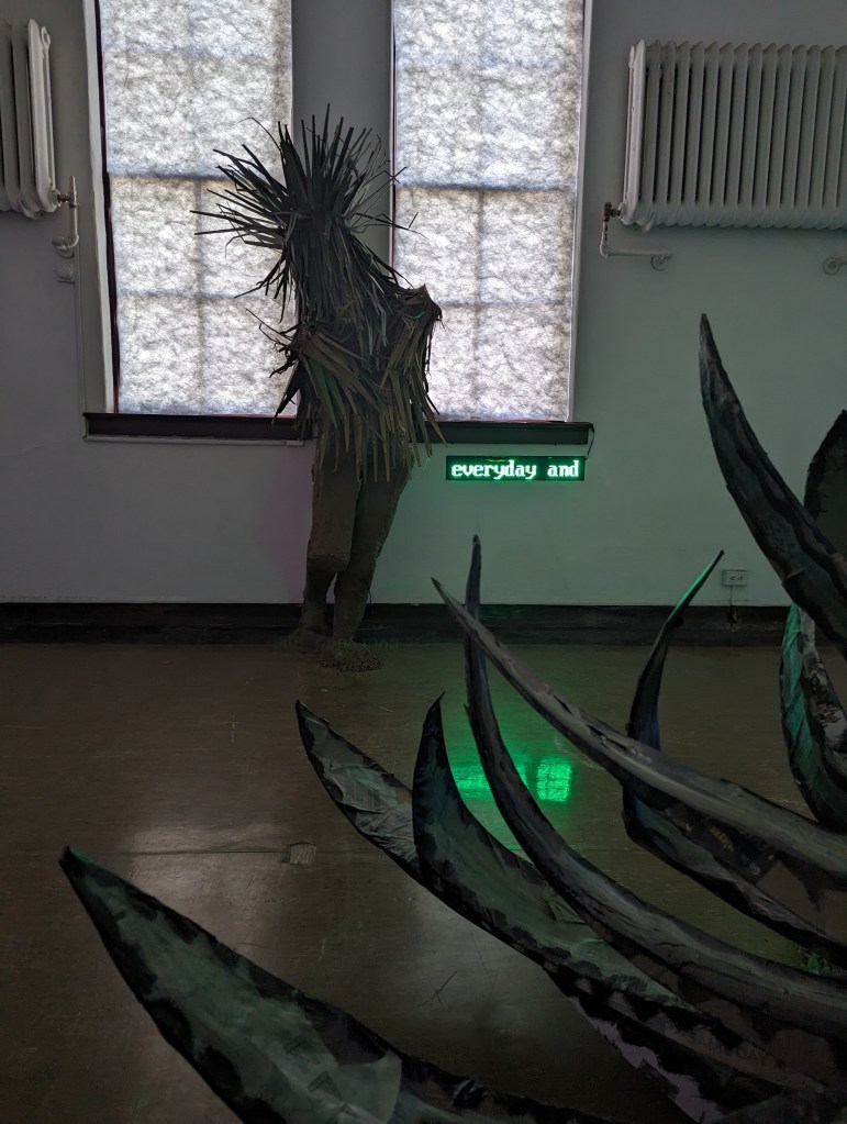 This gallery installation immerses visitors in a surreal world of dreaming hybrid plant people. Created in collaboration with fellow QTBIPOC New Mexico artists Hank Cooper, Pico del Hierro Villa, mk, and Gabriel Maestas, the uncanny cast discusses their lived experiences, from joys to grief and everything in between. Voiced by tonal sound developed by Ryan Parker, each yucca’s narrative is “translated” on LED message boards.