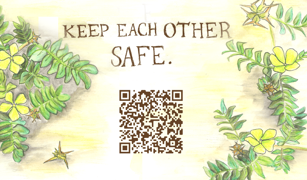 The auxiliary panels bearing Lorde’s quote that titles the artwork and directive to “Keep Each Other Safe” are adorned with lovingly-rendered goathead plants, which reintroduce crucial nutrients to damaged soil. The invocation of these widely-despised yet ecologically helpful plants ties the work to an ongoing body of work by Maestas that centers the same Lorde essay to consider the enduring psychological and ecological harms of colonization. Learn more –>